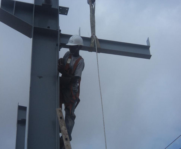 如今最通常門式剛架房屋鋼結構選用H型鋼作為主要構件材料制作。門式剛架在豎向均布荷載作用下,剛架梁與柱連接處、梁跨中處彎矩都較大。在水平荷載作用下,剛架角部也彎矩比較大,其他部位彎矩較小。既而可采用大變小截面的H型鋼,較等截面型鋼節約材料。