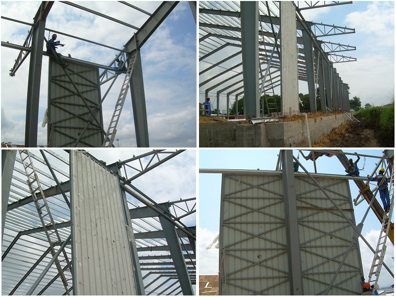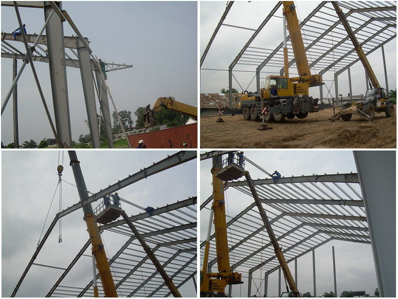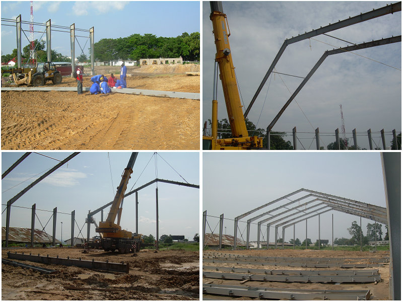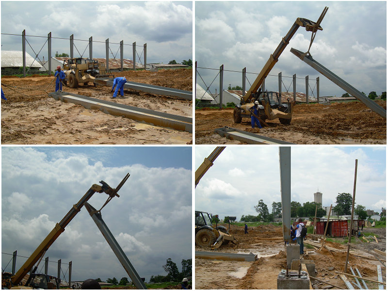 剛果倉庫位于非洲,占地面積3500平方米。主體框架用H型變截鋼制作完成。所有鋼架結構均由螺栓連接。基礎離地面1米以作為防水臺。以下為部分建筑圖片展示: